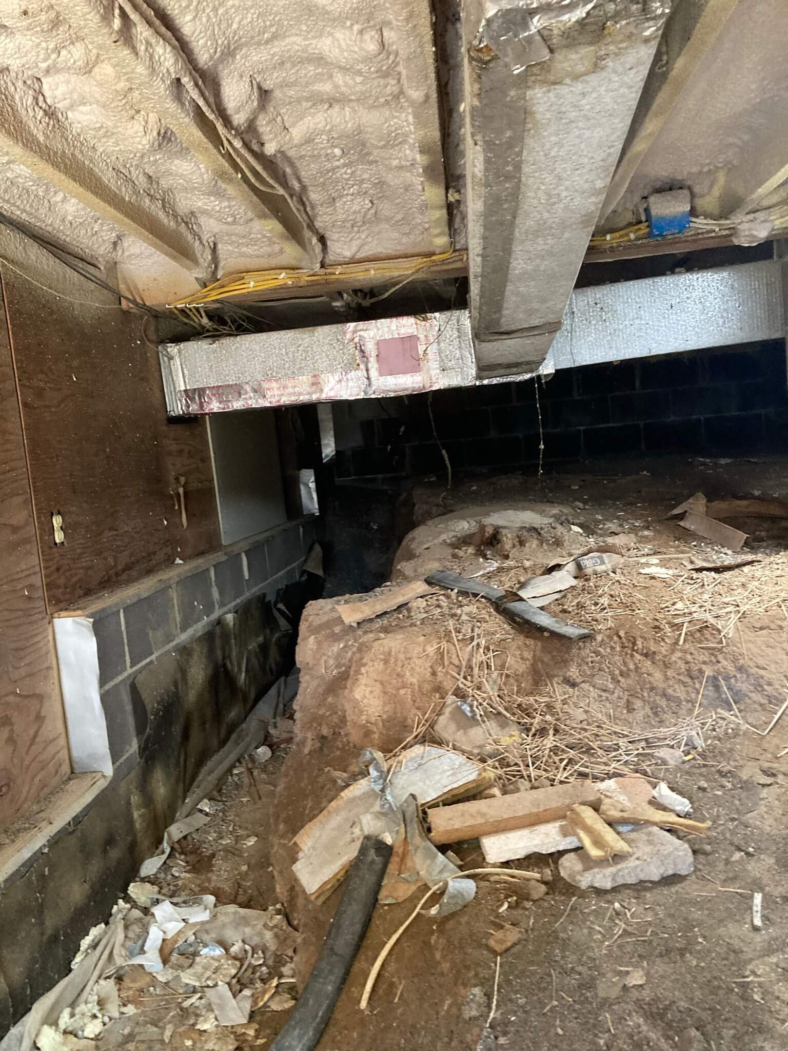 Our crew first lined the uneven earth with gravel to help add some structure to the sloped path. Then lined the earth with a anti-microbial treated liner. The foundation walls were insulated with 2 inches of closed cell foam insulation. This will be a continuous seal onto the liner. The rim joist were then insulated with 4 inches of open cell foam insulation, preventing air leaks from the rim joist area.