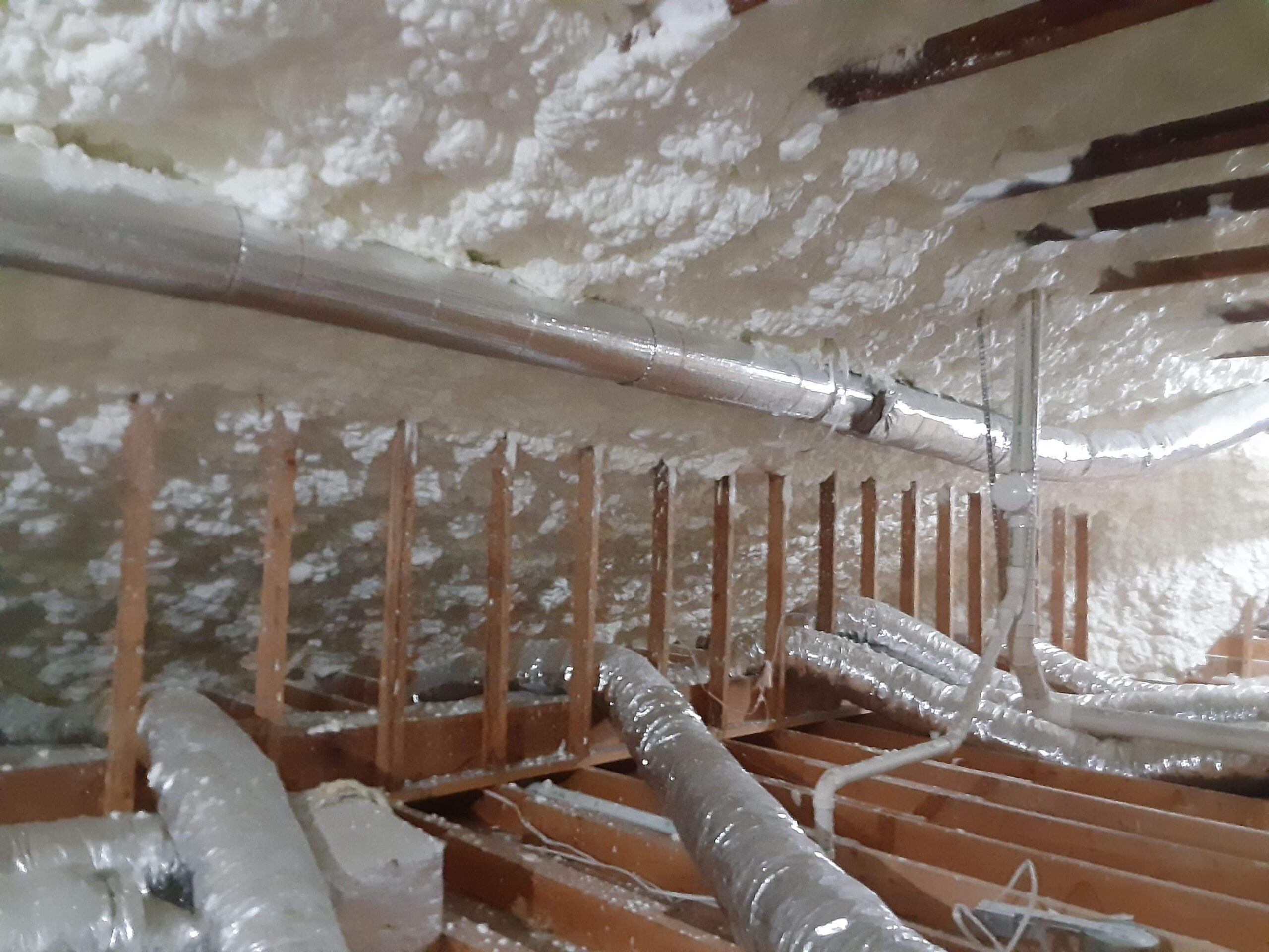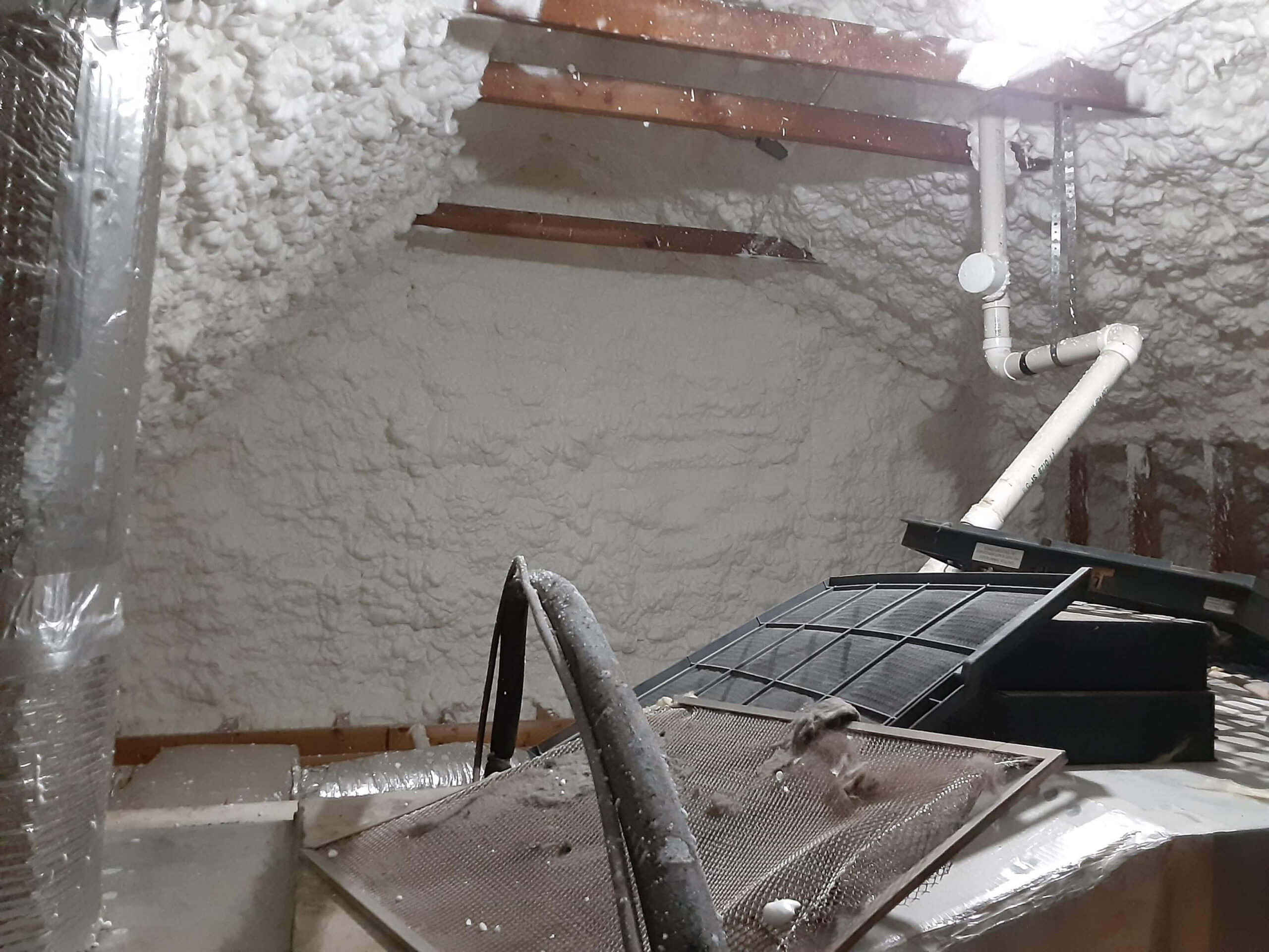 Our solution was to first remove and dispose of the old existing attic insulation. We then installed a nominal 4 inches of open cell spray foam insulation on the roof deck and gable end walls, and the gable vents were sealed with spray foam insulation as well. Since spray foam insulation provides an air seal, this will prevent outside air from entering the attic space, making this area a more consistent temperature year-round. This will, in turn, keep the rooms below a more comfortable temperature and allow the HVAC unit to work less often to maintain a comfortable temperature in the home. The homeowner can expect to see a savings each month in energy costs.