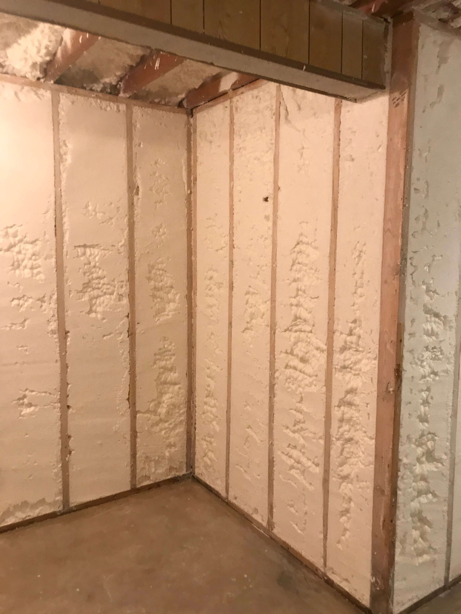 Our crew provided the homeowner with 6″ of open cell foam along the ceiling of the basement; not only did this seal the basement from the first floor space, but also provided sound deadening on the floor of the space as well!