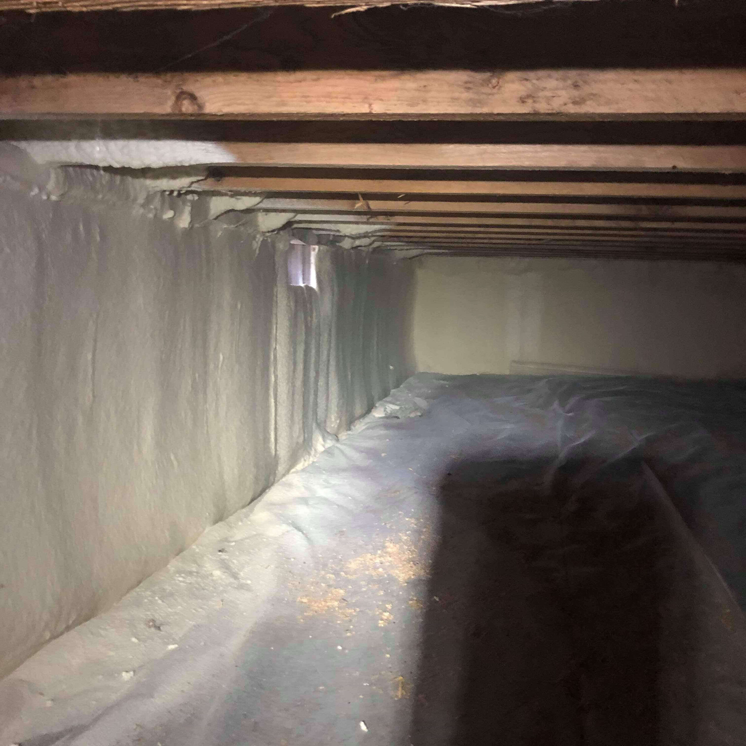 Our team removed the previous liner and replaced it with our preferred liner that was sealed with 1″ of closed cell foam insulation by our insulation division. This creates a continuous seal on the liner, preventing moisture into the crawl space and creating mold/mildew and other future moisture issues as well as preventing heating/cooling escaping from the house.