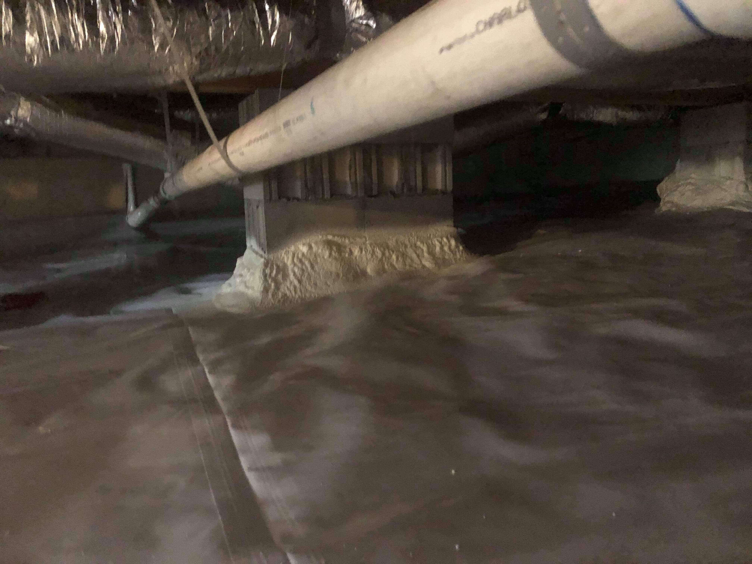 After digging ditches, adding a drainage line and installing a Sump Pump; the crew placed a 20 ml liner between the earth and the crawl space. To create an airtight seal on the area, the crew also added 2″ of closed cell spray foam insulation to the walls and support beams of the crawl space.