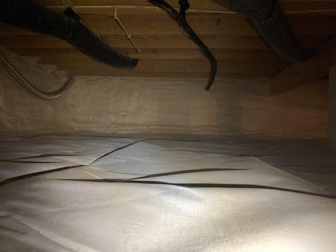 Our crews performed a complete crawlspace encapsulation, adding a heavy duty liner, insulating the crawlspace walls and rim joist with sprayfoam, as well as adding a dehumidifier and sump pump to complete the system.