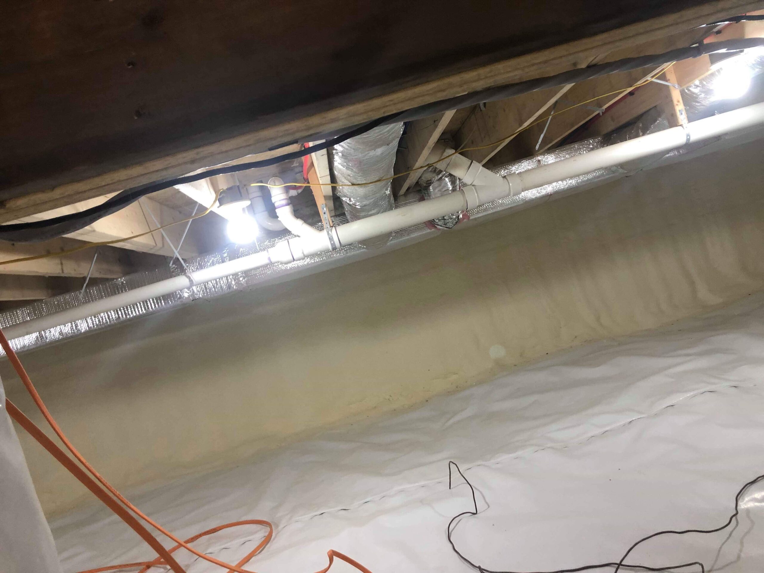 Our team turned the crawl space into a clean, airtight, comfortable space that the customer could be proud of. We covered the ground with a cleanspace liner, sealed at every seam; then applied a vapor barrier close celled foam around the band board and rim joists, down the block, sealing up all crawlspace vents down onto the cleanspace liner.