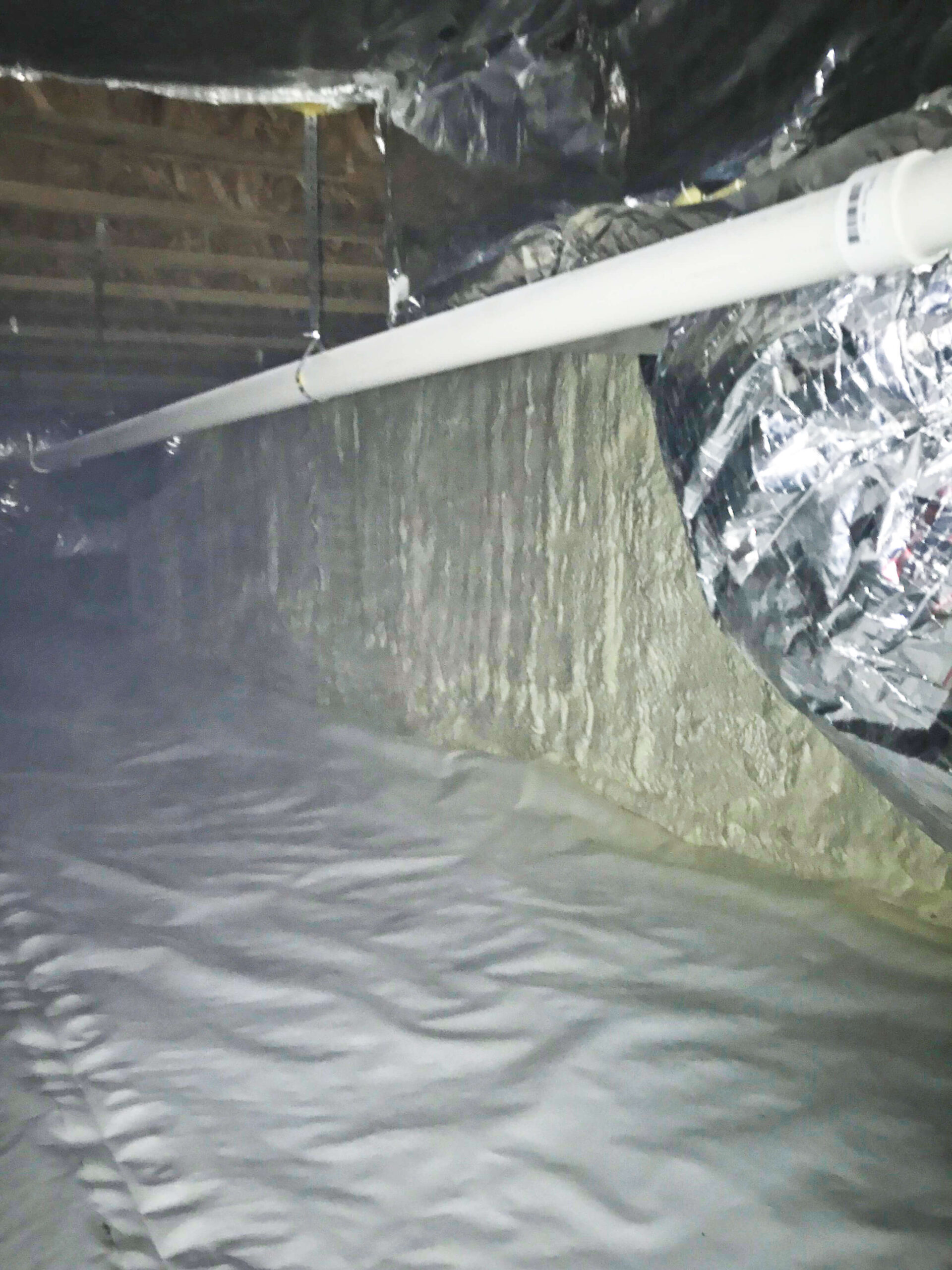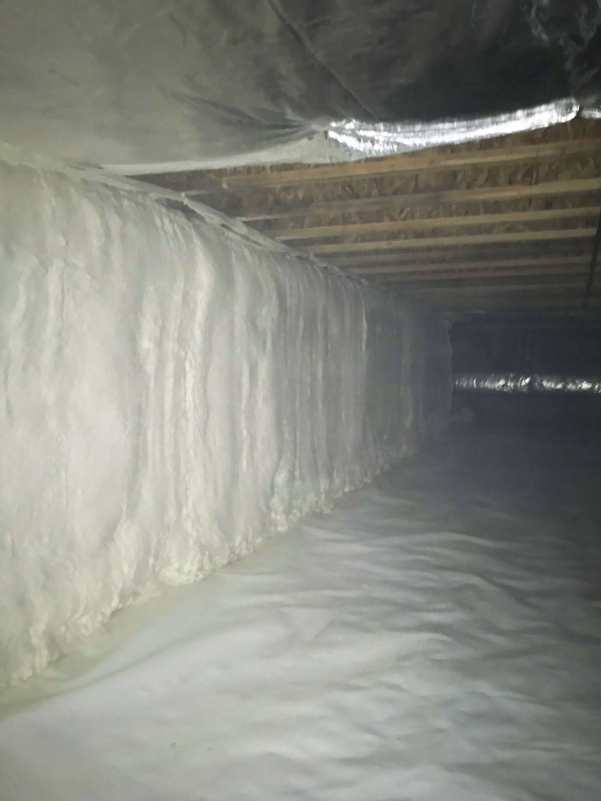 Our crew cleaned and lined the earth of the crawl space with our high/low density liner and spray foam insulating the wall, sealing the liner and creating an encapsulated space. This will prevent the growth of mold/mildew which will also stop the musky smelling odor entering their home. Also with this crawl space being locked off, this will prevent heating and cooling from escaping the house, making the floor and home more energy efficient.