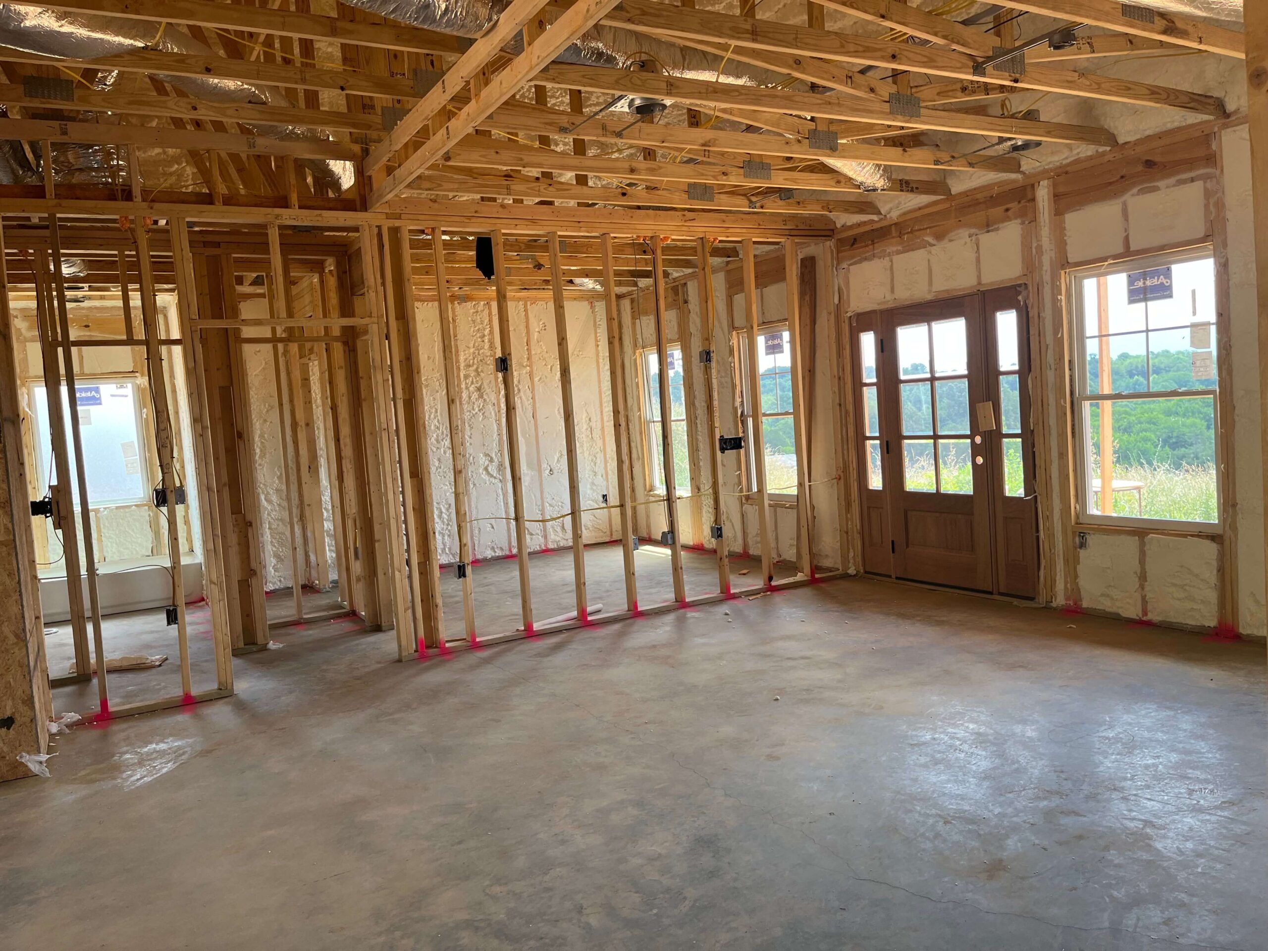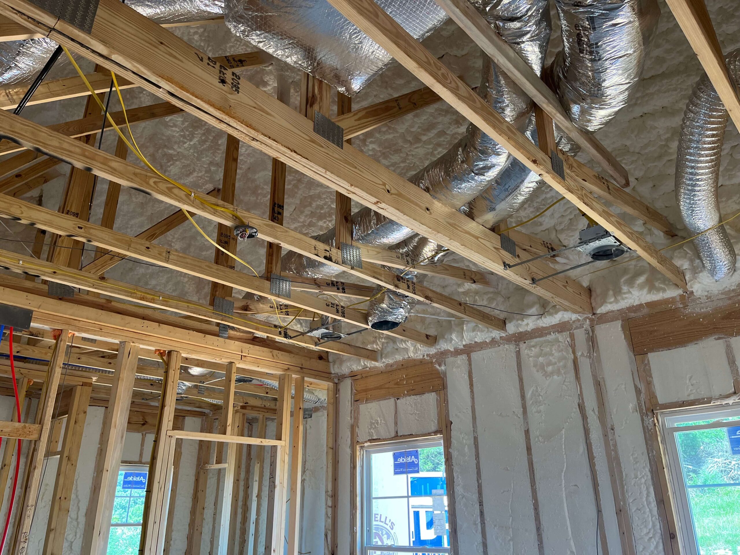 We installed 6 nominal inches of spray foam insulation on the roof deck of the attic space and 4 inches of open cell foam insulation in the wall cavities. Spray foam insulation creates an air seal, sealing up gaps and cracks that fiberglass insulation and cellulose insulation leave open. This means the home will be more comfortable and energy efficient. The home will have less dust, fewer outside allergens allowed in, reduced outside noise, fewer bugs, and lower energy bills.