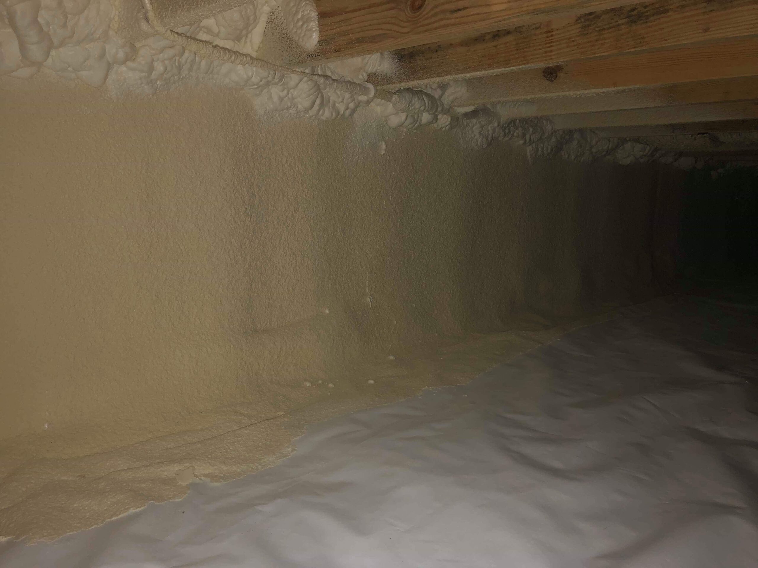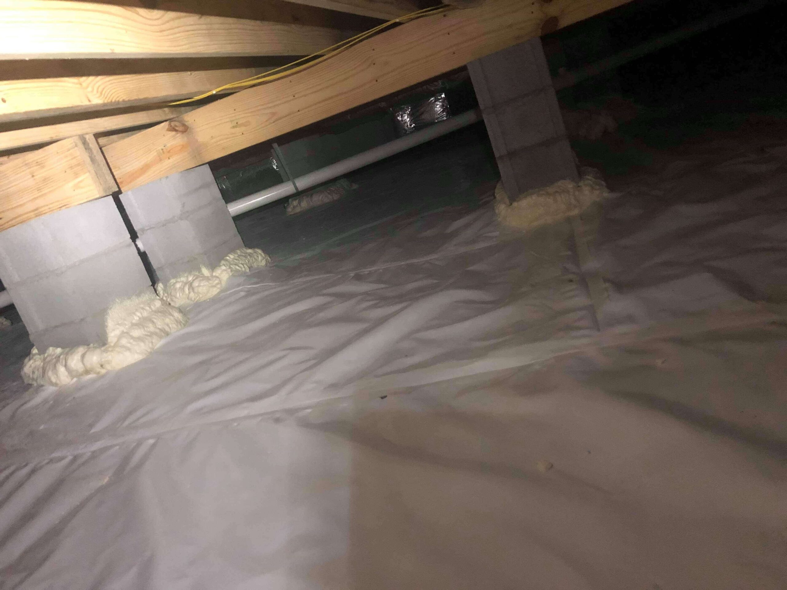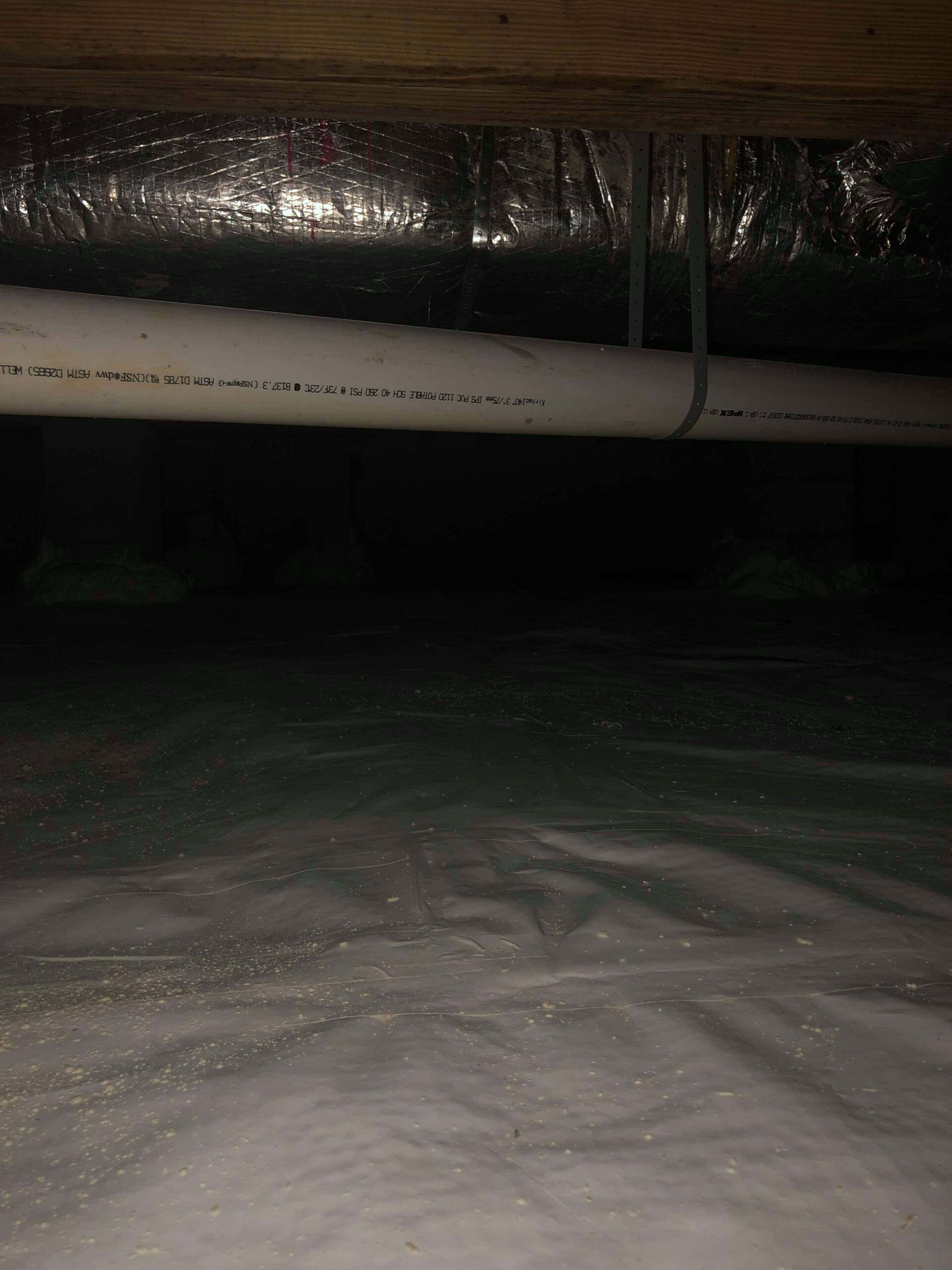 Our crew encapsulated the newly built crawl space with liner, creating a barrier between the crawl space and the earth. This will aid in preventing moisture from entering the area and creating mold, mildew and eventually musty/earthy smells in the home.