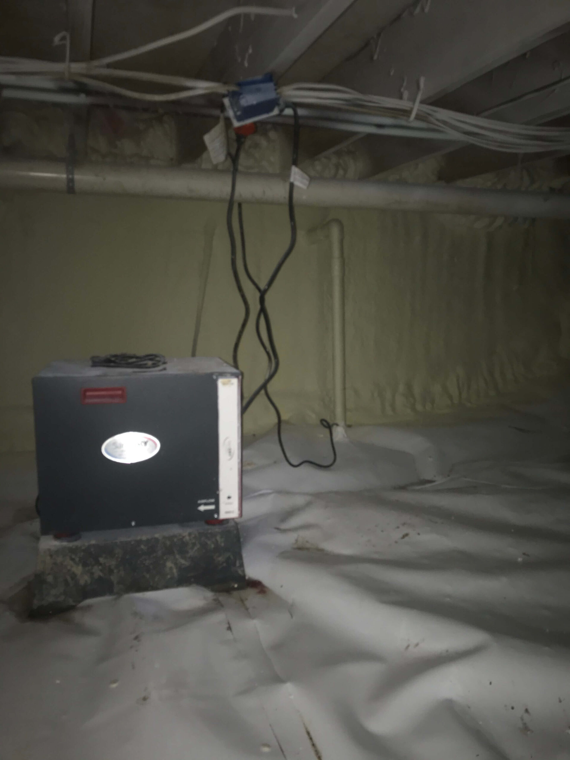 The rim joists were insulated with 4″ of open cell foam, sealing off any air leaks and creating an air tight space, coupled with the crawl space encapsulation door.